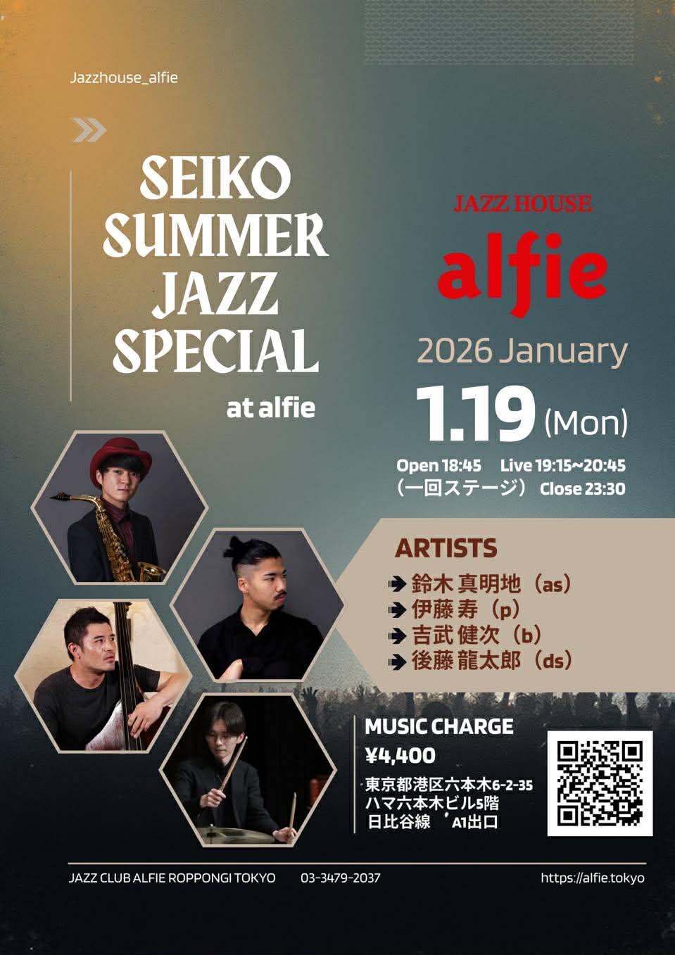 19 (mon) [jazz] "Seiko Summer Jazz Camp Special at alfie" 鈴木真明地(as) 伊東寿(pf) 吉武健次(b) 後藤龍太郎(ds) ¥4400